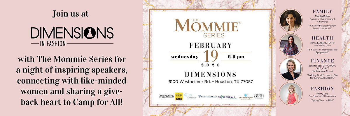 | february 19th, 2020 (6pm - 9pm): the mommie series - spring edition Join us at Dimensions with The Mommie Series - Houston, for a night of inspiring speakers, connecting with like-minded women and sharing a give-back heart to Camp For All! We will also have Sherry Levy, owner and buyer of Dimensions speaking about exciting Spring Trends for 2020. Buy your tickets here. |